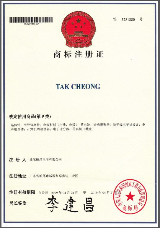 首頁 >> 關(guān)于德昌 >> 商標(biāo)聲明 >> TAK CHEONG(正體)